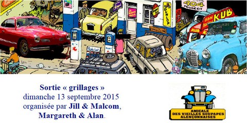 Rendez-vous dimanche 13 septembre 2015 (15 voitures) devant le château de Carrouges pour notre rallye grillade. Après un petit café bien arrosé, ( pluie battante), nous prenons la route en direction de Lassay-les-Châteaux à travers la campagne mayennaise. Nous faisons un arrêt sur le parking de la roseraie mais nous ne pourrons hélas pas visiter celle-ci vu le mauvais temps. Nous repartons donc en direction d'Averton pour rejoindre l'étang des Perles. A Saint-Thomas-des-Courceriers, nous sommes attendus par des amis de Jill et Malcom pour une visite de ce petit village où se déroule tous les étés depuis quelques années une exposition d'épouvantails devant les habitations (plus de 80 épouvantails cette année). Ensuite nous reprenons nos voitures pour nous rendre jusqu’au lieu-dit "le Portail" et en profitons pour visiter ce portail du XVIIième siècle (1657) qui n'est autre qu'une des toutes premières porte de péage à l'entrée de la Cour. En entrant dans ce petit bâtiment, nous découvrons une magnifique charpente dite à la Delorme (la particularité de l'assemblage de cette charpente est le principe du lamellé- collé d'aujourd'hui), puis nous visitons un petit pont Romain ( qui n'est pas une construction romaine) et en repartant vers notre lieu de pique-nique nous apercevons sur notre gauche les ruines d'un château féodal du XVème siècle et derrière celui-ci le très joli petit château du XVIème siecle. Nous repartons vers l'étang des Perles où les grillades nous attendent, préparées par nos amis Jill, Margaret, assistées par un couple d'amis .
