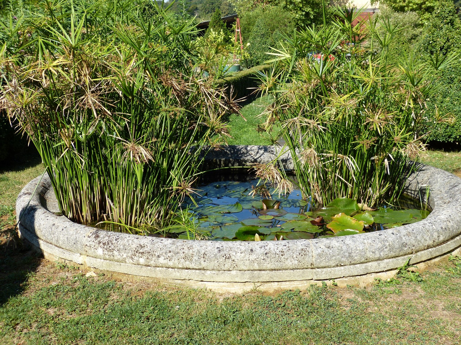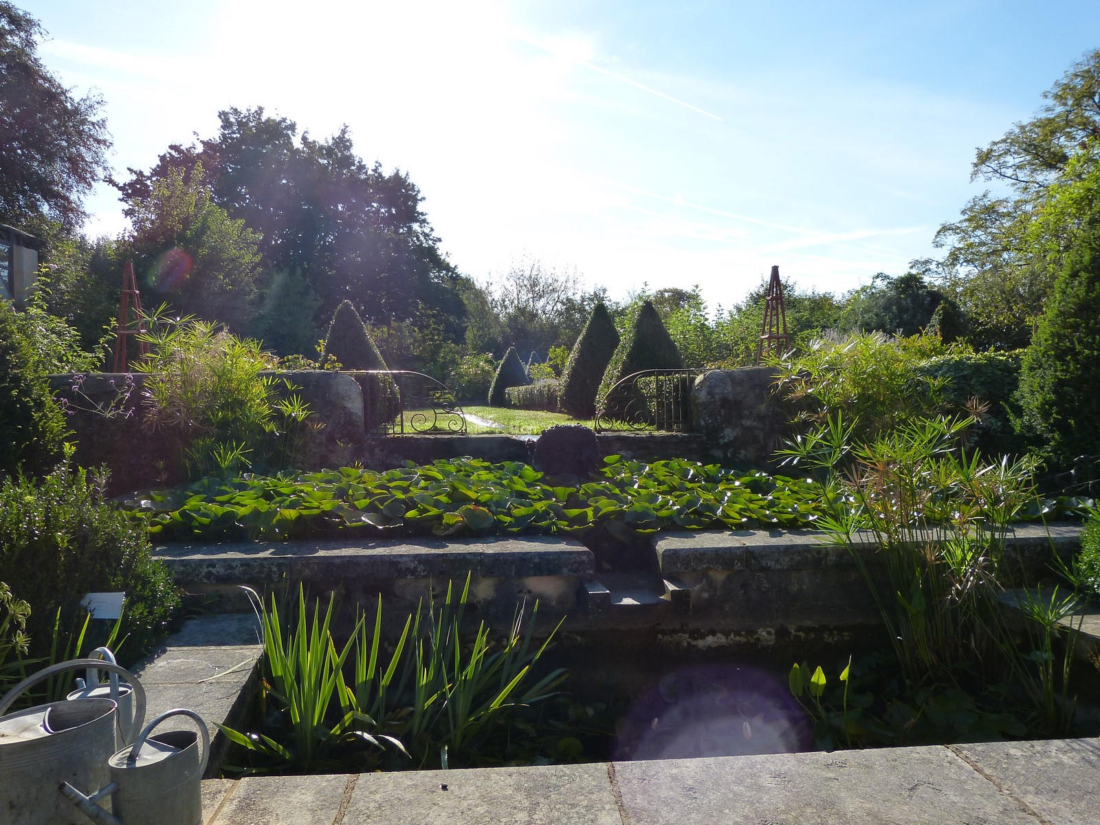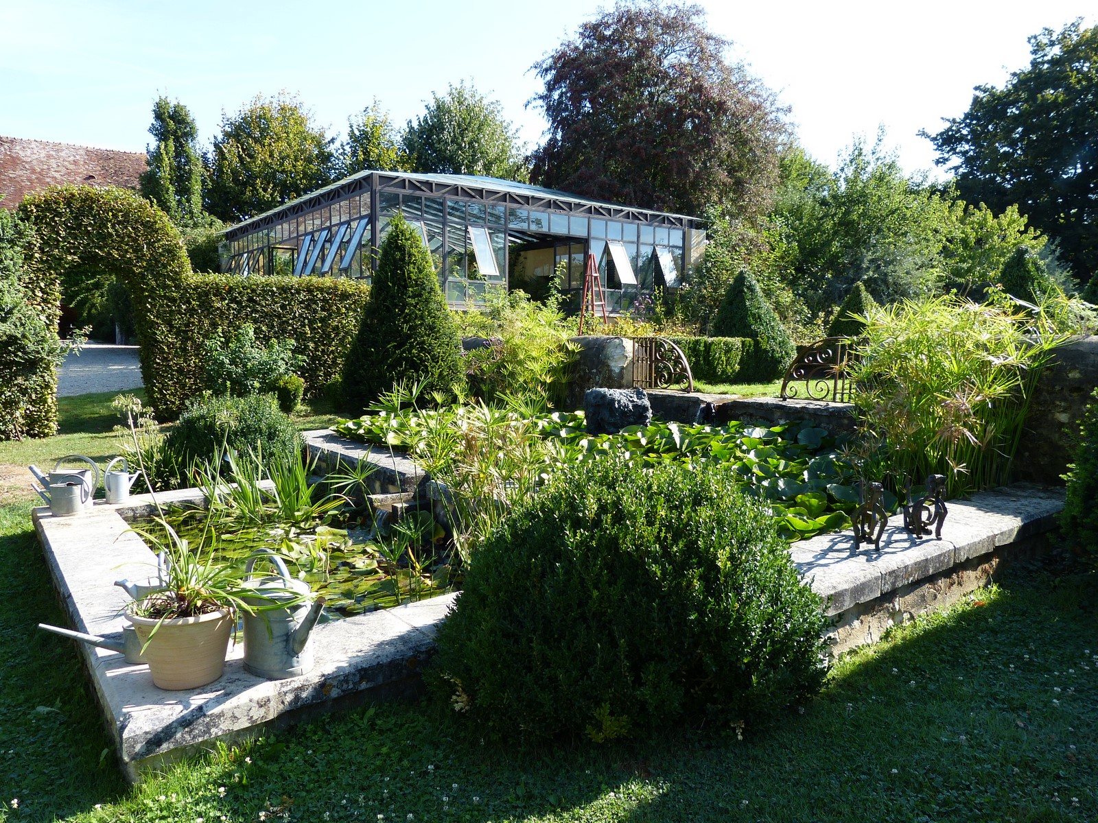 Allée d'Ormes, bassins de potager, d'ornement, rill et cascade. Serre avec collection de cactées et d'agrumes.