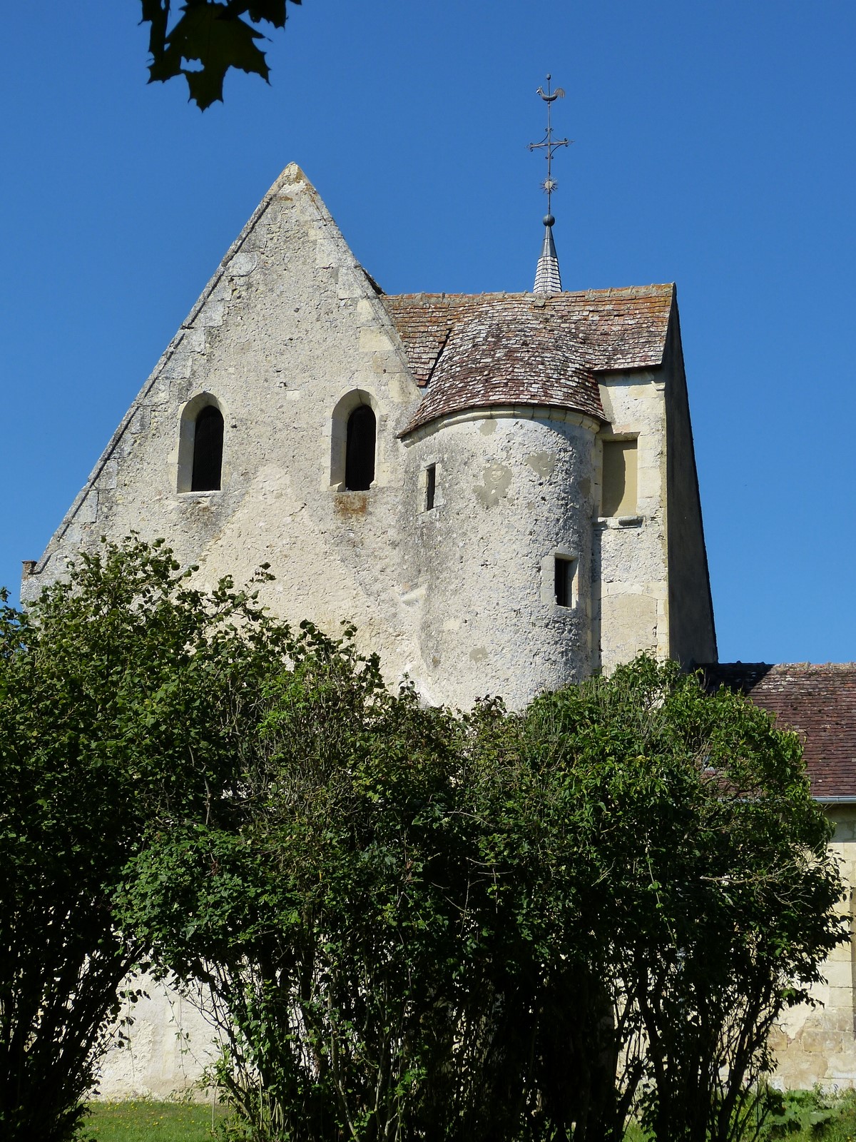 Sont visibles : les extérieurs de l'église avec le porche roman, la tourelle et la chimère sculptée ainsi que l'ancien jardin du prieuré.